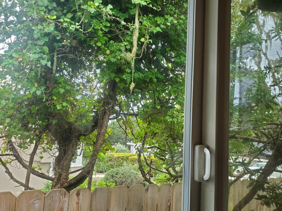 I’ve cut so much that now the trees are two separate entities and not one big blob of green. Daylight comes though in between them. I’ve discovered that the vines are so old, their trunks are five inches thick in places. The whole thing shakes when I’m cutting the smaller branches. It could all topple over in a big windstorm. My electric panel is only feet away from this madness, the vines hanging high above my fence.